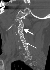 (Click to Enlarge Image) Lateral X-Ray of the neck with a forward bend (flexion). Note the vertebra slipping forward. The black arrows point to the forward slide and forward angulation of the vertebra.