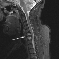 (Click to Enlarge Image) IDR of C6-7. Note the loss of disc height, white signal of the vertebral bodies. Small arrow points to endplate fracture.