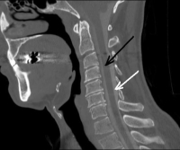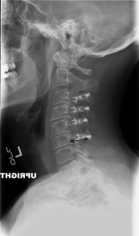 (Click to Enlarge Image) Preoperative lateral x-ray of the cervical spine. The black double arrow notes the reduced diameter of the spinal canal causing compression of the spinal cord.