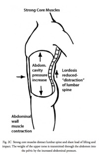 The abdominal contents act like a giant water balloon entirely wrapped by a boa constrictor. Contraction of the abdominal muscles increases pressure in the belly, which is opposed by the pelvic floor below and the diaphragm above which stiffens the lumbar spine even more. (Fig. 2A,B,C)
